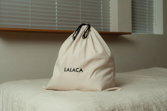 インテリアや身の回りのアイテムとも相性の良いカラーで、持ち運びや収納にも使えるコットンバッグつき。3サイズ3色展開。